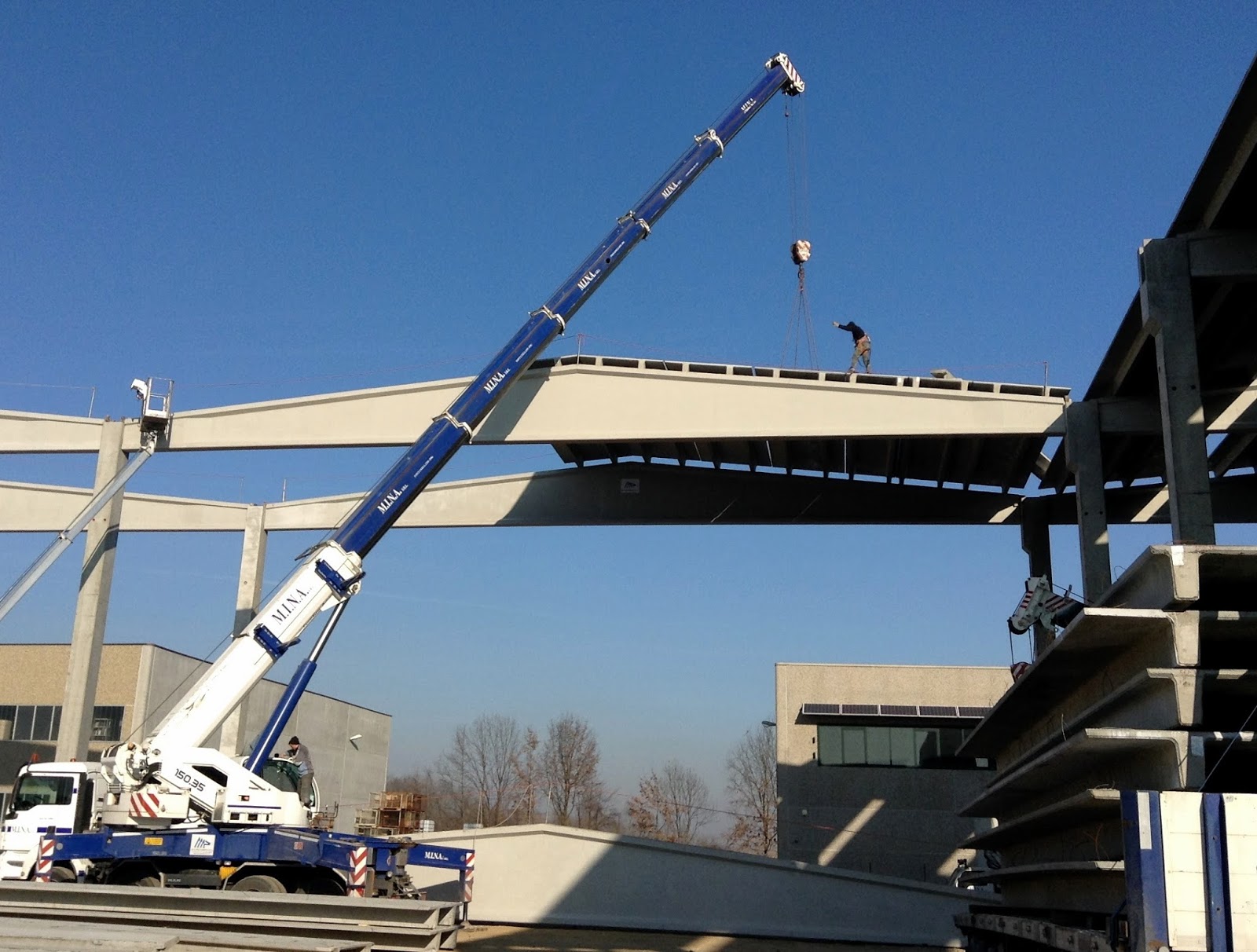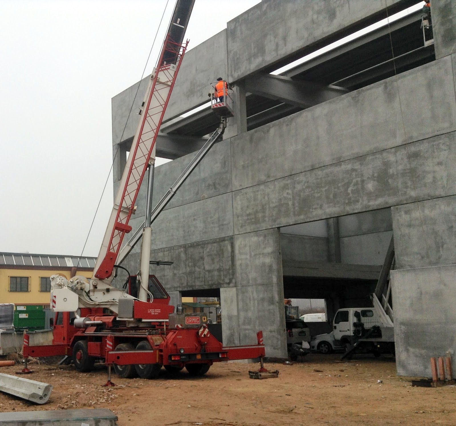 ALFA POSE Srl opera nel settore della fornitura e montaggio di strutture prefabbricate in cemento armato. Petito Prefabbricati, operazioni di montaggio struttura multipiano. Posa Pilastri Capannone prefabbricato Industriale, altezza metri sotto trave.